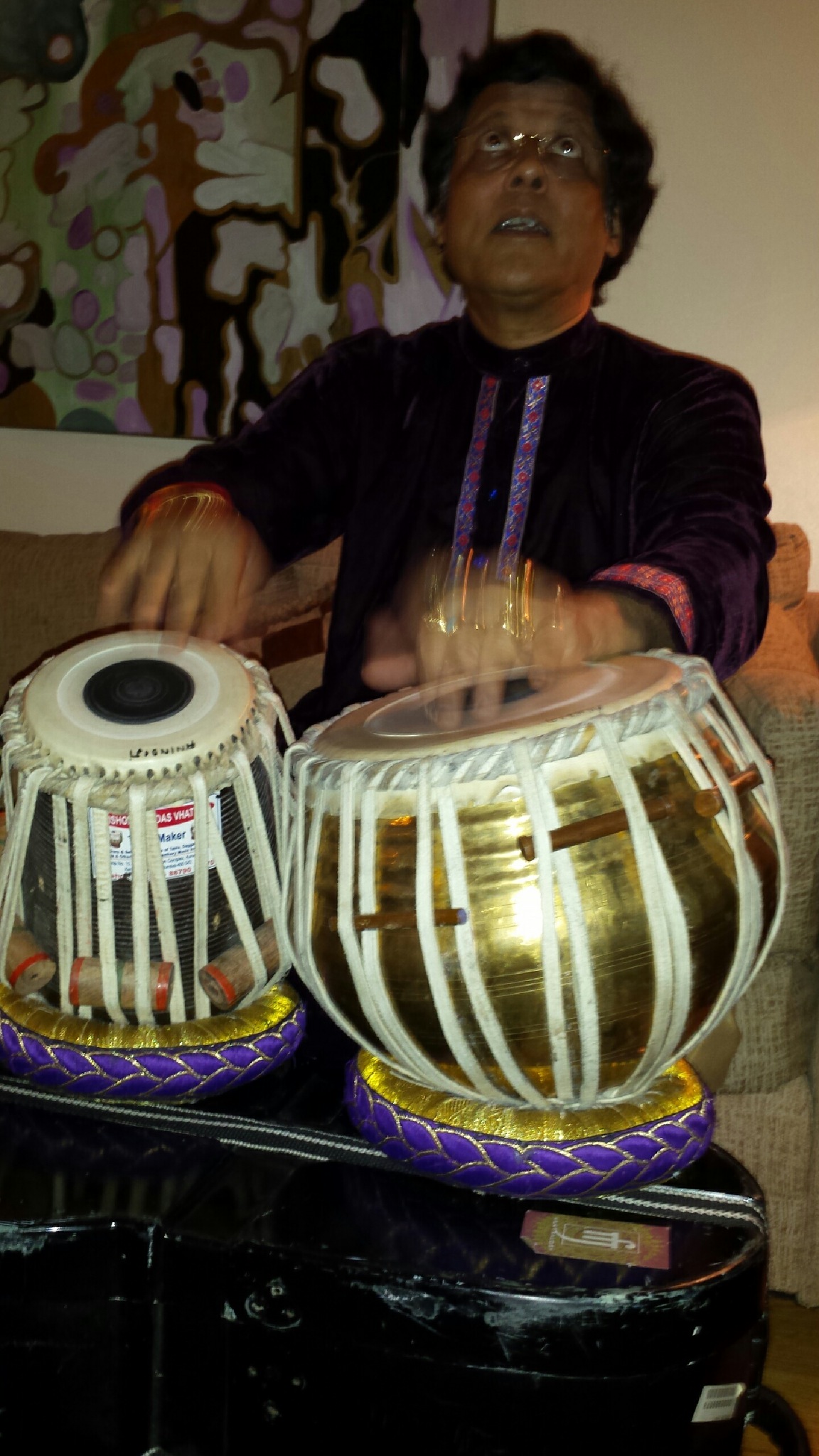 Hearing and comprehending the staggering musical outpourings of tabla artists Anindo Chatterjee, Swapan Chaudhuri and Zakir Hussain is like staring directly at the sun, but in this instance the effect is both healing and stimulating. (I know there are those who actually advocate staring at the sun, but I tried once, and was unable to continue.) Comparing these prodigious musicians to the sun seems apt because their music spawns trillions of rhythmic, timbral, and even melodic progeny that splinter off in innumerable musical vortexes. Suns also because even though they are contemporaries, and play the same percussion instrument, their musical profiles are so differentiated from each other that they seem like different solar systems. Zakir Hussain's gharana (school or tradition) is closest to the ancient pakawaj tradition, and he synergizes a bracing earthiness with a keen awareness of myriad present-day musical cultures outside of South Asia, while building magnificent cathedrals of sound comparable to historic architectural marvels. His prana could power a starship. Anindo Chatterjee possesses an uncanny deftness and elegance that conjures images of nanotechnology as an art form. The range of sounds he might summon at a moment's notice range from a thundering herd of elephants to the glint of moonlight on a beloved's hair. His imagination and facility seem to go beyond human capability. Swapan Chaudhuri unleashes a controlled sonic fury that could overpower an army, and the intelligence behind the onslaught would bring a world champion chess player to his knees. He elevates to the level of the divine both subdued and complex passages, as if we were hearing the breathing of Vishnu. Here are living musicians/improvisers/composers who at least rival and even surpass the best German history has to offer, and I do mean Bach, Beethoven and anyone else. Here are living musicians/improvisers/composers who at least rival and even surpass the best German history has to offer, and I do mean Bach, Beethoven and anyone else. Encyclopedias would do well to include the images of tabla players under Forces of Nature, in part because words are superfluous in beginning to describe and explain the power and beauty of the North Indian classical tabla tradition. And other Hindustani and Karnatic drumming traditions are equally developed and profound, being beyond the focus of this writing and my personal knowledge. One hears an all-encompassing and transcendental symphony of rhythms, melodies, harmonies, timbres, and emotions when master Indian percussionists play, illuminating elements of the Divine and the Human at once. One moment you are on Mount Meru, and the next you are standing in the middle of a breathtakingly colorful and vibrant Calcutta, New Delhi or Bombay street scene. - Michael Robinson, March 2012, Los Angeles